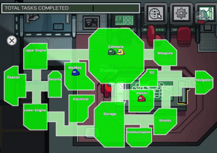 When viewing Admin, the Spy sees the locations of all living players across the map, identified by their colours, making it easier to track and verify locations when giving alibis. The map will update whenever a player moves from one area to another, including through vent systems, as long as they are in a named location (they will not be visible outside or in hallways).